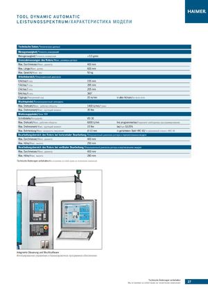 TOOL DYNAMIC AUTOMATIC LEISTUNGSSPEKTRUM/ХАРАКТЕРИСТИКА МОДЕЛИ Technische Daten/Технические данные Messgenauigkeit/Точность измерений Messgenauigkeit/Точность измерения < 0,5 gmm Grenzabmessungen des Rotors/Макс. размеры ротора Max. Durchmesser/Макс. диаметр 400 mm Max. Länge/Макс. длина 600 mm Max. Gewicht/Макс. вес 50 kg Arbeitsbereich/Операционный диапазон X-Achse/X-ось 155 mm Y-Achse/Y-ось 395 mm Z-Achse/Z-ось 205 mm B-Achse/B-ось 360° Eilgänge/Ускоренный ход 20 m/min in allen Achsen/на всех осях Wuchtspindel/Балансировочный шпиндель Max. Drehzahl/Макс. рабочие обороты 1400 U/min/1/мин Max. Drehmoment/Макс. крутящий момент 35 Nm Werkzeugspindel/блок ЧПУ Schnittstelle/Интерфейс VDI 30 Max. Drehzahl/Макс. рабочие обороты 6000 U/min frei programmierbar/подлежит свободному программированию Max. Drehmoment/Макс. крутящий момент 15 Nm bei/при S3-25% Max. Bohrleistung/Макс. мощность сверления Ø 10 mm in gehärtetem Stahl HRC 60/ в закаленной стали с HRC 60 Bearbeitungsbereich des Rotors bei horizontaler Bearbeitung/Операционный диапазан ротора в горизонтальном модусе Max. Durchmesser/Макс. диаметр 400 mm Max. Höhe/Макс. высота 250 mm Bearbeitungsbereich des Rotors bei vertikaler Bearbeitung/Операционный диапазон ротора в вертикальном модусе Max. Durchmesser/Макс. диаметр 400 mm Max. Höhe/Макс. высота 280 mm Technische Änderungen vorbehalten/Мы оставляем за собой право на технические изменения Integrierte Steuerung und Wuchtsoftware Интегрированное управление и балансировочное программное обеспечение Technische Änderungen vorbehaltenМы оставляем за собой право на технические изменения27