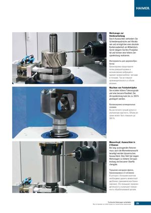 Werkzeuge zur Holzbearbeitung Durch Auswuchten verhindern Sie Schneidenausbrüche und Vibratio- nen und ermöglichen eine absolute Kantensauberkeit am Möbelstück. Somit steigern Sie Ihre Produktivi- tät und können eine höhere Zer- spanleistung realisieren. Инструменты для деревообра- ботки Балансировка предотвратит сколы режущей кромки и возникновение вибраций и сделает кромки мебели чистыми и точными. Так же повысит производительность и объем резания. Wuchten von Feinbohrköpfen Sie erzielen höhere Toleranzgrade und eine bessere Rundheit. Die Zerspanleistung kann bis zu 300 % gesteigert werden. Балансировка шпиндельных головок Вы достигните лучший допуск и улучшенную круглость. Объем ре- зания может быть повышен до 300 %. Messerkopf, Auswuchten in 2 Ebenen Bei lang auskragenden Rotoren muss auch die Momentenunwucht beseitigt werden (dynamisches Auswuchten). Dies führt bei langen Werkzeugen zu höherer Zerspan- leistung und besserer Oberflä- chengüte. Торцовая насадная фреза, балансировка в 2 сечениях В роторах с большим вылетом необходимо удалять моментный дисбаланс (динамическая балан- сировка). Это повышает произво- дительность и улучшает поверх- ность обрабатываемой детали. Technische Änderungen vorbehaltenМы оставляем за собой право на технические изменения29