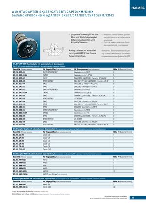 (20) H WUCHTADAPTER SK/BT/CAT/BBT/CAPTO/KM/KM4X БАЛАНСИРОВОЧНЫЙ АДАПТЕР SK/BT/CAT/BBT/CAPTO/KM/KM4X –– µm-genaue Spannung für höchste –– микронно точный зажим для наи- Mess- und Wiederholgenauigkeit высшей точности и стабильности –– Einfaches Austauschen durch измерений kompakte Bauweise –– Простая замена адаптера благо- даря компактной конструкции Achtung: Adapter nur kompatibel Внимание: Балансировочный адап- mit original HAIMER Tool Dynamic тер совместим только с балансиро- Auswuchtmaschinen вочными машинами фирмы HAIMER SK/BT/CAT/BBT Wuchtadapter mit automatischem Spannsystem SK/BT/CAT балансировочный адаптер с автоматической системой зажима Bestell-Nr./Номер заказа für Kegelgrößen/для размера конуса für Anzugsbolzen/для штревелей Höhe H/Высота H [mm] 80.201.330.01 SK30/BT30/BBT301) Gewinde/резьба M12 0 80.201.330.01.IN CAT30 Gewinde/резьба 1/2”-13 0 80.201.330.02 SK30 DIN 69872; ISO 7388-3, Form/Тип AF/AD/AC 0 80.201.330.02 BT30/BBT301) MAS 30°/45°/90°; ISO 7388-3, Form/Тип JD/JF 0 80.201.330.04 SK30 ISO 7388-3, Form/Тип UF/UD/UC 0 80.201.140.01 SK40 DIN 2080 Gewinde/резьба M16 0 80.201.340.01 SK40/BT40/BBT401) Gewinde/резьба M16 0 80.201.340.01.IN CAT40 Gewinde/резьба 5/8”-11 0 80.201.340.02 SK40 DIN 69872; ISO 7388-3, Form/Тип AF/AD/AC 0 80.201.340.02 BT40/BBT401) JIS B6339 0 80.201.340.04 SK40 ISO 7388-3, Form/Тип UF/UD/UC 0 80.201.340.06 BT40 MAS 30°/45°/90°; ISO 7388-3, Form/Тип JD/JF 0 80.201.150.01 SK50 DIN 2080 Gewinde/резьба M24 0 80.201.350.01 SK50/BT50/BBT501) Gewinde/резьба M24 0 80.201.350.01.IN CAT50 Gewinde/резьба 1”-8 0 80.201.350.02 SK50 DIN 69872; ISO 7388-3, Form/Тип AF/AD/AC 0 80.201.350.02 BT50/BBT501) JIS B6339 0 80.201.350.04 SK50 ISO 7388-3, Form/Тип UF/UD/UC 0 80.201.350.06 BT50/BBT501) MAS 30°/45°/90°; ISO 7388-3, Form/Тип JD/ JF 0 Wuchtadapter Capto mit automatischem Spannsystem/ Балансировочный адаптер Capto с автоматической системой зажима Bestell-Nr./Номер заказа für Kegelgrößen/для размера конуса Höhe H/Высота H [mm] 80.201.C3.00 Capto C3 7 80.201.C4.00 Capto C4 7 80.201.C5.00 Capto C5 7 80.201.C6.00 Capto C6 7 80.201.C8.00 Capto C8 7 80.201.C10.00 Capto C10 7 Wuchtadapter KM mit automatischem Spannsystem/Балансировочный адаптер KM с автоматической системой зажима Bestell-Nr./Номер заказа für Kegelgrößen/для размера конуса Höhe H/Высота H [mm] 80.201.KM40.01 KM40 7 80.201.KM50.01 KM50 7 80.201.KM63.01 KM63 7 80.201.KM80.01 KM80 7 80.201.KM100.01 KM100 30 80.201.KM125.00 KM125 (auf Anfrage/=по запросу) Wuchtadapter KM4X mit automatischem Spannsystem/Балансировочный адаптер KM4X с автоматической системой зажима Bestell-Nr./Номер заказа für Kegelgrößen/для размера конуса Höhe H/Высота H [mm] 80.201.KM63.4X KM4X 63 7 80.201.KM100.4X KM4X 100 30 1) BBT: auch geeignet für BIG-Plus/применимо для BIG-Plus Weitere Adapter auf Anfrage erhältlich/Другие адаптеры могут быть предложены Вам по запросу Technische Änderungen vorbehaltenМы оставляем за собой право на технические изменения33