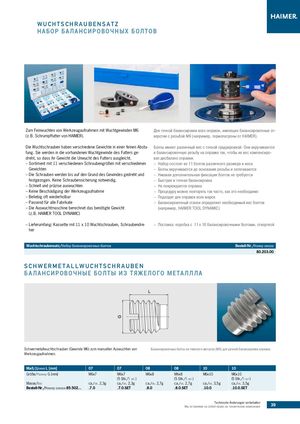 WUCHTSCHRAUBENSATZ НАБОР БАЛАНСИРОВОЧНЫХ БОЛТОВ Zum Feinwuchten von Werkzeugaufnahmen mit Wuchtgewinden M6 Для точной балансировки всех оправок, имеющих балансировочные от- (z. B. Schrumpffutter von HAIMER). верстия с резьбой M6 (например, термопатроны от HAIMER). Die Wuchtschrauben haben verschiedene Gewichte in einer feinen Abstu- Болты имеют различный вес с точной градуировкой. Они вкручиваются fung. Sie werden in die vorhandenen Wuchtgewinde des Futters ge- в балансировочную резьбу на оправке так, чтобы их вес компенсиро- dreht, so dass ihr Gewicht die Unwucht des Futters ausgleicht. вал дисбаланс оправки. – Sortiment mit 11 verschiedenen Schraubengrößen mit verschiedenen –– Набор состоит из 11 болтов различного размера и веса Gewichten –– Болты вкручиваются до основания резьбы и затягиваются – Die Schrauben werden bis auf den Grund des Gewindes gedreht und –– Никакая дополнительная фиксация болтов не требуется festgezogen. Keine Schraubensicherung notwendig. –– Быстрая и точная балансировка – Schnell und präzise auswuchten –– Не повреждается оправка – Keine Beschädigung der Werkzeugaufnahme –– Процедуру можно повторять так часто, как это необходимо – Beliebig oft wiederholbar –– Подходит для оправок всех марок – Passend für alle Fabrikate –– Балансировочный станок определяет необходимый вес болтов – Die Auswuchtmaschine berechnet das benötigte Gewicht (например, HAIMER TOOL DYNAMIC) (z. B. HAIMER TOOL DYNAMIC) – Lieferumfang: Kassette mit 11 x 10 Wuchtschrauben, Schraubendre- –– Поставка: коробка с 11 x 10 балансировочными болтами, отверткой her Wuchtschraubensatz/Набор балансировочных болтовBestell-Nr./Номер заказа 80.203.00 SCHWERMETALLWUCHTSCHRAUBEN БАЛАНСИРОВОЧНЫЕ БОЛТЫ ИЗ ТЯЖЕЛОГО МЕТАЛЛЛА L Schwermetallwuchtschrauben (Gewinde M6) zum manuellen Auswuchten von Балансировочные болты из тяжелого металла (М6) для ручной балансировки оправок. Werkzeugaufnahmen. Maß/Длина L [mm] 07 07 08 08 10 10 Größe/Размер G [mm] M6x7 M6x7 M6x8 M6x8 M6x10 M6x10 (5 Stk./5 шт.) (5 Stk./5 шт.) (5 Stk./5 шт.) Masse/Вес ca./ок. 2,3g ca./ок. 2,3g ca./ок. 2,7g ca./ок. 2,7g ca./ок. 3,5g ca./ок. 3,5g Bestell-Nr./Номер заказа 85.502… .7.0 .7.0.SET .8.0 .8.0.SET .10.0 .10.0.SET Technische Änderungen vorbehaltenМы оставляем за собой право на технические изменения39 G