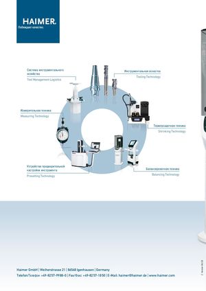 Система инструментального Инструментальная оснастка хозяйства Tooling Technology Tool Management Logistics Измерительная техника Measuring Technology Термоусадочная техника Shrinking Technology Устройства предварительной настройки инструмента Балансировочная техника Presetting Technology Balancing Technology Haimer GmbH | Weiherstrasse 21 | 86568 Igenhausen | Germany Telefon/Телефон +49-82 57-99 88-0 | Fax/Факс +49-82 57-18 50 | E-Mail: haimer@haimer.de | www.haimer.com 2. Version 04/18