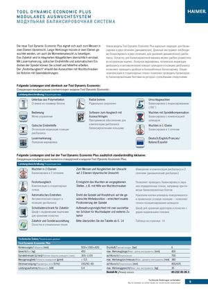 TOOL DYNAMIC ECONOMIC PLUS MODULARES AUSWUCHTSYSTEM МОДУЛЬНАЯ БАЛАНСИРОВОЧНАЯ СИСТЕМА Die neue Tool Dynamic Economic Plus eignet sich auch zum Messen in Новая модель Tool Dynamic Economic Plus идеально подходит для балан- zwei Ebenen (dynamisch). Lange Werkzeuge müssen in zwei Ebenen ge- сировки в двух сечениях (динамически). Длинный инструмент необходи- wuchtet werden, um auch die Momentenunwucht zu beseitigen. мо балансировать в двух сечениях, для удаления динамического дисба- Das Zubehör wird in integrierten Ablagefächern übersichtlich verstaut. ланса. Оснастку для балансировочной машины можно удобно разместить Mit Lasermarkierung, optischer Eindrehhilfe und automatischem Ein во встроенном ящичке. Лазерная маркировка, оптическая индикация drehen der Spindel können Sie schnell und fehlerfrei arbeiten. дисбаланса и автоматический поворот шпинделя в позицию дисбаланса Der „Festortausgleich“ erlaubt das Auswuchten mit Wuchtschrauben позволяют проводить удобную и безошибочную балансировку. Опция bei Rotoren mit Gewindebohrungen. «компенсация в стационарных точках» позволяет проводить балансиров- ку балансировочными болтами на роторах с резьбовыми отверстиями. Folgende Leistungen sind identisch zur Tool Dynamic Economic: Следующие конфигурации соответствуют модели Tool Dynamic Economic: Leistungsbeschreibung/Характеристика Unterbau aus Polymerbeton Radial bohren Umschlagwuchten Станина из полимер-бетона Радиальное сверление Балансировка с индексированием (180 °) Bedienung Software zum Ausgleich mit Wuchten mit Spindelkompensation Меню управления Auswuchtringen Балансировка с компенсацией Программное обеспечение для шпинделя Optische Eindrehhilfe компенсации дисбаланса Wuchten in 1 Ebene Оптическая индикация позиции балансировочными кольцами Балансировка в 1 сечении дисбаланса Lasermarkierung Deutsch/English/Français/ Лазерная маркировка Italiano/Español Folgende Leistungen sind bei der Tool Dynamic Economic Plus zusätzlich standardmäßig inklusive: Следующая конфигурация является стандартной в модели Tool Dynamic Economic Plus: Leistungsbeschreibung/Характеристика Wuchten in 2 Ebenen Zum Messen und Ausgleichen der Unwucht Измерение и компенсация дисбаланса в 2 Балансировка в 2 сечениях auf 2 Ebenen (dynamische Unwucht) сечениях (динамический дисбаланс) Festortausgleich Ermöglicht das Wuchten an vorgegebenen Позволяет проводить балансировку в зара- Компенсация в стационарных Stellen, z. B. mit Hilfe von Wuchtschrauben нее определенных точках, например при по- точках мощи балансировочных болтов Automatisches Eindrehen Dreht die Spindel auf Knopfdruck auf die ge- Нажатием кнопки шпиндель поворачивается Автоматический поворот в wünschte Winkelposition – erleichtert exakte в правильную угловую позицию – позволяет позицию дисбаланса Positionierung der Spindel точное позиционирование шпинделя Schubladenschrank für Zubehör Aufbewahrungsmöglichkeit mit zwei ausziehba- Шкаф для хранения адаптеров и оснастки с Шкаф с выдвижными ящичками ren Schüben für Wuchtadapter und weiteres Zu- двумя выдвижными полками для хранения оснастки behör Zubehör und Sonderausstattung Bitte überprüfen Sie die Tabelle ab S. 14 Таблица на странице 14 Оснастка и специальные опции Technische Daten/Технические данные Tool Dynamic Economic Plus Abmessungen/Габариты [mm] 500 × 1500 × 820 Druckluft/Сжатый воздух [bar] 6 Gewicht/Вес [kg] 450 max. Werkzeuglänge/Макс. длина инструмента [mm] 400 Spindeldrehzahl [U/min]/Рабочие обороты шпинделя [1/мин] 300 – 1100 auf Wunsch/Опционально 700 Messgenauigkeit/Точность измерений [gmm] < 0,5 max. Werkzeugdurchmesser/Макс. диаметр инструмента [mm] 380 Stromversorgung/Параметры сети [V/Hz] 230/50 – 60 auf Wunsch/Опционально [mm] 400/425 Leistungsaufnahme/Мощность [kW] 0,4 max. Werkzeuggewicht/Макс. вес инструмента [kg] 30 Bestell-Nr./Номер заказа 80.222.00.09.3 Technische Änderungen vorbehaltenМы оставляем за собой право на технические изменения9