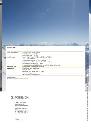 RF1060-1e · 00.0219 · VM · PDF · All specifications are given without commitment. Subject to amendment. Technical data Rotor dimensions – Maximum rotor weight1): 30 kg – Rotor diameter max.: 500 mm – Rotor height max.: 150 mm Machine data – Width, depth, height: 1200 mm, 2700 mm, 1800 mm – Total weight: 2100 kg – Mains connection: 400 V / 3 Ph / 50/60 Hz – Balancing speed fully adjustable from 600 – 1000 rpm – Measurement uncertainty2): 4 gmm – 2-coloured painting RAL7035 (light grey), RAL 7024 (graphite grey) Measuring unit – CAB 870 with touch screen operation Accessories – Interface for auto load/unload – Vacuum unit – Extension rotor weight max. 1) : 70 kg – Double drilling spindle – Measurement static / dynamic 1) rotor plus adapter 2) scattering part of the measurement uncertainty SCHENCK RoTec GmbH Landwehrstraße 55 64293 Darmstadt, Germany www.schenck-rotec.com E-Mail: rotec@schenck.net Tel.: +49 (0) 6151 - 32 23 11 Fax: +49 (0) 6151 - 32 23 15
