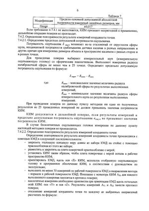 Модификация Пределы основной допускаемой абсолютной погрешности измерений линейных размеров, мм Gauge ±0,017 - ] — ------------ - w ^* iv x i ж\ xi|yjim vxxviim w7 дальнейшие операции поверки не производят. 7.4.2. Определение повторяемости результата измерений координаты точки. 7.4.2.1. Определение предельно допускаемой погрешности ощупывания. Погрешность ощупывания д 0Щуп возникает из-за отклонений от округлости сферы щупа, неодинаковой погрешности срабатывания датчика касания в разных направлениях и других причин при измерениях размеров объекта в пространстве касанием с разных сторон и в разных точках. Для проведения поверки выбирают измерительный птуп (измерительную ощупывающую головку) со сферическим наконечником. Выполняют измерения радиуса калибровочной сферы не менее чем в 25 точках. Определяют предельно допускаемую погрешность ощупывания по формуле: 3 ощуп ~ R m CIKC ~ R -M U H , гДе: R-м акс ~ максимальное значение величины радиуса калибровочной сферы по результатам выполненных измерений; Кмин - минимальное значение величины радиуса сферы измерительного щупа по результатам выполненных измерений. При проведении поверки по данному пункту методики ни один из полученных результатов из 25 проведенных измерений не должен превышать значения погрешности КИМ. КИМ допускается к дальнейшей поверке, если результаты измерений и предельно допускаемая погреш ность ощупывания о 0щуп не превышает значения погрешности КИМ. В случае бесконтактных ощупывающих головок измерения по данному пункту настоящей методики поверки не производятся. 7.4.2.2. Определение повторяемости результата измерений координаты точки Определение повторяемости результата измерений координаты точки производится с помощью КМД в следующей последовательности: - закрепить эталонную концевую меру длины из набора КМД на стойке с помощью приспособления из этого же набора; - разместить и закрепить на плите поверочной приспособление с мерой; - установить КИМ таким образом, чтобы плита поверочная с мерой попали в рабочее пространство КИМ; - ориентировать КМД, вдоль оси «X» КИМ, используя отобранную ощупывающую головку и программное обеспечение КИМ, в соответствии с руководством по эксплуатации; - выполнить не менее 30 измерений по рабочей поверхности КМД в направлении вектора - нормали к рабочей поверхности КМД. Показание с монитора КИМ А» для каждого выполненного измерения заносится в протокол поверки; - аналогичные измерения необходимо произвести при ориентации КМД вдоль остальных осей КИМ: оси «У» и оси «Z». Результаты измерений Ayi и Azi занести протокол поверки; - отклонение измерений координаты точки по каждому из выбранных направлений рассчитать по формуле: