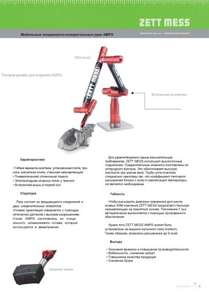 Мобильные координатно-измерительные руки AMPG Winkel Типовой дизайн для моделей AMPG Встроенный противовес Для удовлетворения самым взыскательным Характеристики требованиям, ZETT MESS использует высокоточные подшипники. Соединительные элементы изготовлены из • Гибкие варианты монтажа: установочная плита, тре- углеродного волокна. Это обеспечивает высокую нога, магнитная плита, стальная направляющая. жесткость при малом весе. Трубы угле-пластика • Пневматический стояночный тормоз специально намотаны так, что коэффициент теплового • Электроподьем опорных колес у треноги расширения близок к нулю и компенсация температуры • Встроенная мышь в первой оси не является необходимым. Структура Гибкость Рука состоит из вращающихся соединений и Чтобы расширить диапазон измерения для шести двух соединительных элементов. осевых КИМ компания ZETT MESS предлагает стальную Угловая ориентация измеряется с помощью направляющую на гранитной основе. Положение 7 оси оптических датчиков с высоким разрешением. автоматически вычисляется с помощью программного Стыки AMPG изготовлены из специ- обеспечения. ального алюминиевого сплава, которыйиспользуетсявавиастроении.Кроме того ZETT MESS AMPG может бытьустановлена на машине колонного типа (патент). Таким образом, возможно расширение до 9 осей. Выгода • Экономия времени и повышение производительности • Мобильность, снижение затрат • Повышение качества продукции • Снижение брака Лазерный сканер 3