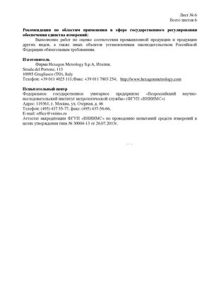 Лист № 6 Всего листов 6 Рекомендации по областям применения в сфере государственного регулирования обеспечения единства измерений: Выполнение работ по оценке соответствия промышленной продукции и продукции других видов, а также иных объектов установленным законодательством Российской Федерации обязательным требованиям. Изготовитель Фирма Hexagon Metrology S.p.A, Италия, Strada del Portone, 113 10095 Grugliasco (TO), Italy Телефон: +39 011 4025 111;Факс: +39 011 7803 254; http://www.hexagonmetrology.com Испытательный центр Федеральное государственное унитарное предприятие «Всероссийский научно- исследовательский институт метрологической службы» (ФГУП «ВНИИМС») Адрес: 119361, г. Москва, ул. Озерная, д. 46 Телефон: (495) 437 55-77, факс: (495) 437-56-66, E-mail: office@vniims.ru Аттестат аккредитации ФГУП «ВНИИМС» по проведению испытаний средств измерений в целях утверждения типа № 30004-13 от 26.07.2013г. . .