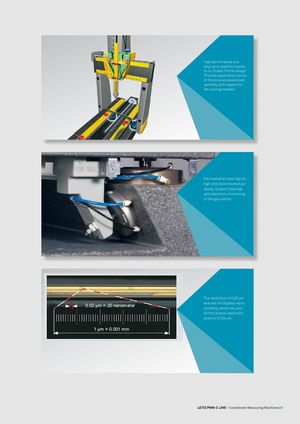 High performance and long-term stability thanks to its Closed Frame design. The load application points of the drive are positioned centrally with respect to the moving masses. Pre-loaded air bearings on high-precision dovetail gui- deway. Support bearings with electronic monitoring of the gap widths. The resolution of 0.02 µm 0.02 µm = 20 nanometer ensures the highest repro-ducibility, while the Leitz Inifnity boasts resolution down to 0.004 µm. 1 µm = 0.001 mm LEITZ PMM-C LINE – Coordinate Measuring Machines | 9