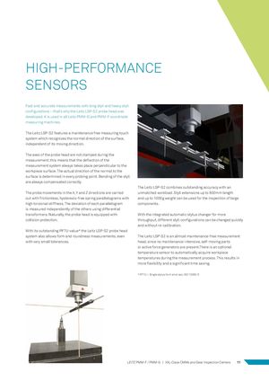 HIGH-PERFORMANCE SENSORS Fast and accurate measurements with long styli and heavy styli configurations – that’s why the Leitz LSP-S2 probe head was developed. It is used in all Leitz PMM-G and PMM-F coordinate measuring machines. The Leitz LSP-S2 features a maintenance free measuring touch system which recognizes the normal direction of the surface, independent of its moving direction. The axes of the probe head are not clamped during the measurement; this means that the deflection of the measurement system always takes place perpendicular to the workpiece surface. The actual direction of the normal to the surface is determined in every probing point. Bending of the styli are always compensated correctly. The Leitz LSP-S2 combines outstanding accuracy with an The probe movements in the X, Y and Z directions are carried unmatched workload. Styli extensions up to 800mm length out with frictionless, hysteresis-free spring parallelograms with and up to 1000g weight can be used for the inspection of large high torsional stiffness. The deviation of each parallelogram components. is measured independently of the others using differential transformers. Naturally, the probe head is equipped with With the integrated automatic stylus changer for more collision protection. throughput, different styli configurations can be changed quickly and without re-calibration. With its outstanding PFTU-value* the Leitz LSP-S2 probe head system also allows form and roundness measurements, even The Leitz LSP-S2 is an almost maintenance-free measurement with very small tolerances. head, since no maintenance-intensive, self-moving parts or active force generators are present.There is an optional temperature sensor to automatically acquire workpiece temperatures during the measurement process. This results in more flexibility and a significant time saving. * PFTU = Single stylus form error acc. ISO 10360-5 LEITZ PMM-F / PMM-G | XXL-Class CMMs and Gear Inspection Centers 11