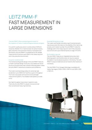 LEITZ PMM-F FAST MEASUREMENT IN LARGE DIMENSIONS The Leitz PMM-F offers outstanding performance for Expanded temperature range the inspection of medium sized and large workpieces and gears. The modern and flexible manufacturing of mechanical parts requires accurate information on the stability of the machining It is used for quality assurance in a wide variety of different process, and it needs it quickly. The Leitz PMM-F meets this industries. Whether it’s in machine tools, the optical industry, challenge, both in the measuring room and in the production gear production, the automotive industry or aerospace and environment with a permitted temperature range of 18-24°C. aeronautics, the Leitz PMM-F is predestined for the reliable measurement of precision parts. Both in the measuring room No foundation required and in the production environment. The Leitz PMM-F features an integrated active pneumatic damping system and therefore does not require a special A superior overall concept foundation. It can be placed anywhere in the factory. The Leitz The mechanical all granite design of the Leitz PMM-F features PMM-F is easy to install and can be moved to other locations if a modern overhead design. It ensures a very stable and robust neccessary. structure. An active pneumatic vibration damping system makes the Leitz PMM-F insensitive to vibrations and oscillations. The Leitz PMM-F from Hexagon Metrology is available with measuring ranges of 3000 x 2000 x 1000 mm and 3000 x 2000 The modern overhead design allows for extremely high x 1600 mm. acceleration up to 3000mm/s² and thus superior throughput. The X-axis is equipped with dual drive and dual length measurement systems. This enables travel speeds up to 600 mm/s. Very high throughput means lower inspection costs. That’s why the Leitz PMM-F is clearly more economical than conventional measuring machines. LEITZ PMM-F / PMM-G | XXL-Class CMMs and Gear Inspection Centers 7