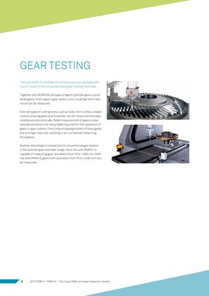 GEAR TESTING The Leitz PMM-F and PMM-G machines are also available with short Z-axes for the use as dedicated gear testing machines. Together with QUINDOS, all types of gears (cylinder gears, spiral bevel gears, clutch gears, gear racks, curvic couplings and many more) can be measured. Even all types of cutting tools, such as hobs, form cutters, shaper cutters, shaving gears and broaches, can be measured precisely, reliable and economically. Pallet measurement of gears is also possible as there is no rotary table required for the inspection of gears or gear cutters. Time consuming alignments of heavy gears are no longer required, resulting in an unmatched measuring throughput. Another advantage in comparison to conventional gear testers is the possible gear diameter range. Here, the Leitz PMM-F is capable of measuring gear diameters from 10 to 1,950 mm. With the Leitz PMM-G, gears with diameters from 10 to 4,450 mm can be measured. 8 LEITZ PMM-F / PMM-G | XXL-Class CMMs and Gear Inspection Centers