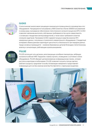 ПРОГРАММНОЕ ОБЕСПЕЧЕНИЕ Q-DAS Статистический анализ имеет решающее значение для промышленного производства и его оборудования. Находящееся в пользовании у 8000 клиентов и более 200000 пользователей по всему миру, программное обеспечение статистического контроля процессов (SPC) Q-DAS позволяет компаниям выполнять собственные требования (в том числе совместимость с основными стандартами автопроизводителей), а также своих требования клиентов и внешних аудиторов. Программа Q-DAS содержит мощные средства анализа SPC измеренных данных, полученных от различного измерительного оборудования. Стандартный интерфейс обмена данными гарантирует целостность и безопасность при передаче данных. Среди основных преимуществ -- снижение бракованных деталей благодаря статистическому анализу и сигнализации, работающим в реальном времени. PULSE PULSE использует сеть датчиков, регистрирующих колебания температуры, вибрацию и влажность вблизи КИМ. Предлагая, помимо прочего, оповещение о состоянии и сбоях оборудования, PULSE образует централизованную информационную панель, которая доступна операторам в любое время. PULSE позволяет получить полную картину рабочего процесса, предлагает способы оптимизации измерений и предоставляет информацию для систем анализа качества.Поставляется с отдельными моделями. HexagonMI.com | HEXAGON MANUFACTURING INTELLIGENCE 11