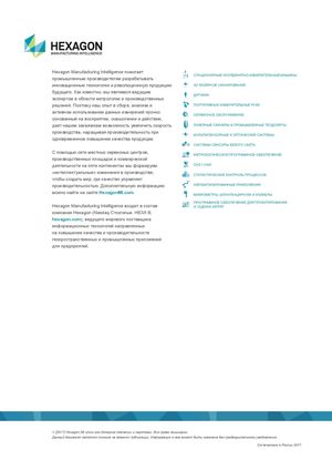 Hexagon Manufacturing Intelligence помогает СТАЦИОНАРНЫЕ КООРДИНАТНО-ИЗМЕРИТЕЛЬНЫЕ МАШИНЫ промышленным производителям разрабатывать инновационные технологии и революционную продукцию 3D ЛАЗЕРНОЕ СКАНИРОВАНИЕ будущего. Как известно, мы являемся ведущим ДАТЧИКИ экспертом в области метрологии и производственных решений. Поэтому наш опыт в сборе, анализе и ПОРТАТИВНЫЕ ИЗМЕРИТЕЛЬНЫЕ РУКИ активном использовании данных измерений прочно СЕРВИСНОЕ ОБСЛУЖИВАНИЕ основанный на восприятии, осмыслении и действии, дает нашим заказчикам возможность увеличить скорость ЛАЗЕРНЫЕ СКАНЕРЫ & ПРОМЫШЛЕННЫЕ ТЕОДОЛИТЫ производства, наращивая производительность при МУЛЬТИСЕНСОРНЫЕ И ОПТИЧЕСКИЕ СИСТЕМЫ одновременном повышении качества продукции. СИСТЕМЫ СЕНСОРЫ БЕЛОГО СВЕТА С помощью сети местных сервисных центров, МЕТРОЛОГИЧЕСКОЕ ПРОГРАММНОЕ ОБЕСПЕЧЕНИЕ производственных площадок и коммерческой деятельности на пяти континентах мы формируем CAD / CAM «интеллектуальные» изменения в производстве, СТАТИСТИЧЕСКИЙ КОНТРОЛЬ ПРОЦЕССОВ чтобы создать мир, где качество управляет производительностью. Дополнительную информацию АВТОМАТИЗИРОВАННЫЕ ПРИЛОЖЕНИЯ можно найти на сайте HexagonMI.com. МИКРОМЕТРЫ, ШТАНГЕНЦИРКУЛИ И КАЛИБРЫ ПРОГРАММНОЕ ОБЕСПЕЧЕНИЕ ДЛЯ ПРОЕКТИРОВАНИЯ Hexagon Manufacturing Intelligence входит в состав И ОЦЕНКИ ЗАТРАТ компании Hexagon (Nasdaq Стокгольм: HEXA B; hexagon.com), ведущего мирового поставщика информационных технологий направленных на повышение качества и производительности геопространственных и промышленных приложений для предприятий. © [2017] Hexagon AB и/или его дочерние компании и партнеры. Все права защищены. Данный документ является точным на момент публикации. Информация в нем может быть изменена без предварительного уведомления. Отпечатано в России 2017.
