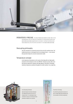 Persistently precise. The new PrimeScan sensor is only one of the reasons why the Leitz SIRIO SX is superior to other production-floor measuring machines in matters of accuracy. Further features also have beneficial effects on the accuracy of the measuring machine. Decoupling philosophy The drive introduces no unwanted transverse forces into the machines frame. The loadbearing structure is decoupled from the metrological frame – a new concept that guarantees long-term accurate measurement results. Temperature concept Local temperature fluctuations are the enemy of metrology. We use high-quality materials in the development of the Leitz SIRIO SX. Technical ceramics offer excel- lent thermal conductivity combined with high stiffness. PrimeTherm Technology minimises temperature gradients throughout the whole machine. Every single day. Leitz decoupling philosophy PrimeTherm Technology Specially designed mechanics decouple An artificially aged special concrete mix the loadbearing structure from the me- with a through-flow liquid ventilation sys- trological frame. The metrological frame tem increases the thermal conductivity. provides the accuracy, the structural frame provides the stability of the machine. 8