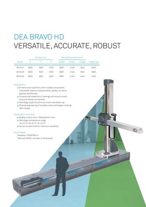 DEA BRAVO HD Versatile, Accurate, Robust Strokes (mm) Overall Dimentions (mm) Series X Y Z Length Width Height Weight (kg) 60.16.21 6000 1600 2100 6997 4148 3547 4640 60.16.25 6000 1600 2500 6997 4148 3947 4690 60.16.30 6000 1600 3000 6997 4148 4447 4750 Applications Dimensional inspection of thin-walled components, bodyshells, chassis, subassemblies, panels, car doors, glasses, dashboards Dimensional inspection of castings, structural aircraft, ship and railway components Metrology support to die and mould manufacturing Reverse engineering of complex contoured shapes creating CAD models Operating Environment Quality control room, “Meisterbock” room Metrologic temperature range: 18–22 °C; 16–24 °C; 16–32 °C Dynamics optimized for maximum versatility Probe Heads Standard: TESASTAR-m Optional: CW43L-mw (two or three axes)