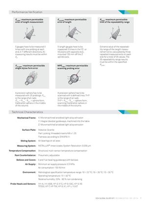 Performance Verification E0,MPE : maximum permissible E : 150,MPE maximum permissible R0,MPL: maximum permissible error of length measurement error of length limit of the repeatability range 5 gauges have to be measured 3 5 length gauges have to be Extreme value of the repeatabi- times with one probing at each measured 3 times in the YZ- or lity range of the length measu- end, in 7 different directions. All XZ plane with opposite styli, rement error, calculated by three measuring results must be within mounted 150 mm off the Z repeated measurements on each E0. spindle axis. size for a total of 35 values. The 35 repeatability range results must be within the specified PFTU,MPE : maximum permissible MPETHP/t: maximum permissible R0,MPL. single stylus form error scanning probing error A precision sphere has to be A precision sphere has to be measured with 25 probings. PFTU scanned with 4 defined lines. THP is the range of all radii. is the range of all radii. PFTU = Rmax - Rmin = sphere form. THP = Rmax - Rmin = sphere form, Calibration sphere in the middle scanning. Calibration sphere in of the volume. the middle of the volume. Technical Characteristics Mechanical Frame: X: Micromachined anodized light alloy extrusion Y: Integral dovetail guideways, machined into the table Z: Micromachined anodized light alloy extrusion Surface Plate: Material: Granite Part Locking: threaded inserts M8 x 1.25 Flatness: according to DIN 876/III Sliding System: Air bearings on all axes Measuring System: METALLUR® linear scales. System Resolution: 0.039 μm Temperature Compensation: Structural multi-sensor temperature compensation Ram Counterbalance: Pneumatic, adjustable Bellows and Covers: X and Y air bearing guideways with bellows Air Supply: Minimum air supply pressure: 0.5 MPa Air consumption: 150 Nl/min Environment: Metrological specification temperature range: 18 ÷ 22 °C; 16 ÷ 26 °C; 15 ÷ 30 °C Operating temperature: 10 ÷ 40 °C Relative humidity: 20% - 90 % non condensing Probe Heads and Sensors: HH-A, HH-AS8, HP-S-X1C, HP-S-X3C, HP-S-X5 TP200, HP-T, HP-TM, HP-S-X1, HP-L-10.6T DEA GLOBAL SILVER SF | DS CMM 037/02 - EN - 07/14 7
