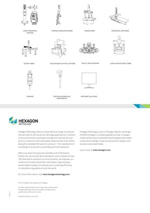LASER TRACKERS & PORTABLE MEASURING ARMS BRIDGE CMMS HORIZONTAL ARM CMMS STATIONS GANTRY CMMS MULTISENSOR & OPTICAL SYSTEMS WHITE LIGHT SCANNERS ULTRA HIGH ACCURACY CMMS SENSORS PRECISION MEASURING SOFTWARE SOLUTIONS INSTRUMENTS Hexagon Metrology offers a comprehensive range of products Hexagon Metrology is part of Hexagon (Nordic exchange: and services for all industrial metrology applications in sectors HEXA B). Hexagon is a leading global provider of design, such as automotive, aerospace, energy and medical. We sup- measurement and visualisation technologies that enable port our customers with actionable measurement information customers to design, measure and position objects, and along the complete life cycle of a product – from development process and present data. and design to production, assembly and final inspection. Learn more at www.hexagon.com With more than 20 production facilities and 70 Precision Centers for service and demonstrations, and a network of over 100 distribution partners on five continents, we empower our customers to fully control their manufacturing processes, enhancing the quality of products and increasing efficiency in manufacturing plants around the world. For more information, visit www.hexagonmetrology.com © 2014 Hexagon Metrology. Part of Hexagon All rights reserved. Due to continuing product development, Hexagon Metrology reserves the right to change product specifications without prior notice. Printed in Germany. July 2014 773217