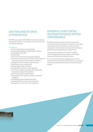 DEA TORO AND PC-DMIS POWERFUL SHEET METAL A WINNING DUO ROUTINES OPTIMIZE SYSTEM PERFORMANCE DEA TORO is equipped with PC-DMIS, the industrial measuring software that provides a multi-tasking, multi-user environment PC-DMIS includes powerful point-and-click sheet metal for inspection operations. measuring routines for the automatic inspection of thin-walled components, and the presentation of results for intuitive Main Features interpretation. The sheet metal routines are efficient software User-friendly Windows operating system tools that simplify and speed up part programming. Customizable 3D graphics-based operator interface Direct CAD Interface (DCI) They only need the operator to enter data. The system IN/OUT DMIS automatically generates the part program containing the Direct part measurement using original CAD data necessary positioning and probing instructions. Direct measurement without the help of a CAD model, with At run time, automatic and self–adaptive search routines automatic recognition of part shapes and features overcome element mispositioning. If the element is not present, Management of non-contact measuring probes automatic skip cycles allow the machine to continue the part DCC program-driven measurement program. Reverse engineering functionality Management of continuous scanning probes Off-line part programming supported by original CAD design data and graphical simulations On-line part programming (Self-Teach) Advanced tools for program proofing, fine tuning, and debugging Flexible graphical and analytical reporting Advanced SPC and process monitoring options Management of multi-arm measuring systems Horizontal Arm Coordinate Measuring Machine DEA TORO | 3