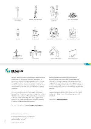 PRECISION MEASURINGINSTRUMENTS PORTABLE MEASURING ARMS LASER TRACKERS& STATIONS WHITE LIGHT SCANNERS SENSORS BRIDGE CMMS MULTISENSOR & OPTICAL SYSTEMS ULTRA HIGH ACCURACY CMMS HORIZONTAL ARM CMMS GANTRY CMMS AUTOMATED APPLICATIONS SOFTWARE SOLUTIONS Hexagon Metrology offers a comprehensive range of products Hexagon is a leading global provider of information and services for all industrial metrology applications in technologies that drive productivity and quality across sectors such as automotive, aerospace, energy and medical. industrial and geospatial applications. Hexagon’s solutions We support our customers with actionable measurement integrate sensors, software, domain knowledge and customer information along the complete life cycle of a product – from workflows into intelligent information ecosystems that deliver development and design to production, assembly and final actionable information. They are used in a broad range of vital inspection. industries. With more than 20 production facilities and 70 Precision Hexagon (Nasdaq Stockholm: HEXA B) has more than 15,000 Centers for service and demonstrations, and a network of over employees in 46 countries and net sales of approximately 100 distribution partners on five continents, we empower our 2.6bn EUR. customers to fully control their manufacturing processes, enhancing the quality of products and increasing efficiency Learn more at www.hexagon.com in manufacturing plants around the world. For more information, visit www.hexagonmetrology.com © 2015 Hexagon Metrology. Part of Hexagon All rights reserved. Due to continuing product development, Hexagon Metrology reserves the right to change product specifications without prior notice. Printed in Germany. May 2015 773201