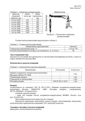 Лист № 6 Всего листов 7 Таблица 4 – Габаритные размеры машин Диапазон Длина Длина измерений плеча, мм предплечья, (диаметр), мм мм от 0 до 1200 310 319 от 0 до 2000 600 400 от 0 до 2500 750 500 от 0 до 3000 900 600 от 0 до 3500 1050 700 от 0 до 4000 1200 800 от 0 до 4500 1350 900 Рисунок 5 – Обозначение габаритных размеров машин Условия эксплуатации машин представлены в таблице 5. Таблица 5 – Условия эксплуатации машин Наименование характеристики Значение Температура окружающей среды, °С от 0 до +50 Относительная влажность воздуха, без конденсата, %, не более 90 Знак утверждения типа наносится на титульный лист руководства по эксплуатации типографским способом, а также на корпус машины методом наклейки. Комплектность средства измерений Таблица 6 – Комплектность средства измерений Наименование Обозначение Количество Машина координатно-измерительная портативнаяHexagon ABSOLUTE ARM- 1 шт. Упаковочный чемодан - 1 шт. Руководство по эксплуатации - 1 экз. Методика поверки МП № 203-31-2019 1 экз. Поверка осуществляется по документу МП № 203-31-2019 «Машины координатно-измерительные портативные Hexagon ABSOLUTE ARM. Методика поверки», утверждённому ФГУП «ВНИИМС» 22 апреля 2019 г. Основные средства поверки: - меры для поверки систем координатно-измерительных ROMER Absolute Arm (рег. № 64593-16). Знак поверки наносится на свидетельство о поверке. Допускается применение аналогичных средств поверки, обеспечивающих определение метрологических характеристик поверяемых СИ с требуемой точностью. Сведения о методиках (методах) измерений приведены в эксплуатационном документе.