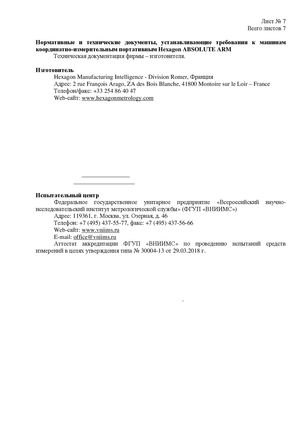 Лист № 7 Всего листов 7 Нормативные и технические документы, устанавливающие требования к машинам координатно-измерительным портативным Hexagon ABSOLUTE ARM Техническая документация фирмы – изготовителя. Изготовитель Hexagon Manufacturing Intelligence - Division Romer, Франция Адрес: 2 rue François Arago, ZA des Bois Blanche, 41800 Montoire sur le Loir – France Телефон/факс: +33 254 86 40 47 Web-сайт: www.hexagonmetrology.com Испытательный центр Федеральное государственное унитарное предприятие «Всероссийский научно- исследовательский институт метрологической службы» (ФГУП «ВНИИМС») Адрес: 119361, г. Москва, ул. Озерная, д. 46 Телефон: +7 (495) 437-55-77, факс: +7 (495) 437-56-66 Web-сайт: www.vniims.ru E-mail: office@vniims.ru Аттестат аккредитации ФГУП «ВНИИМС» по проведению испытаний средств измерений в целях утверждения типа № 30004-13 от 29.03.2018 г. .