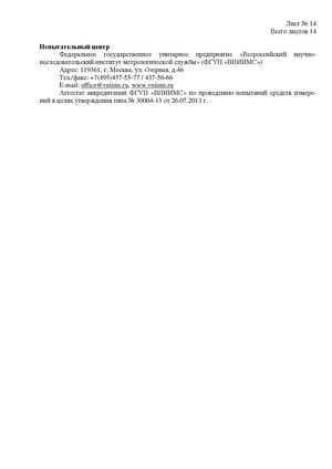 Лист № 14 Всего листов 14 Испытательный центр Федеральное государственное унитарное предприятие «Всероссийский научно- исследовательский институт метрологической службы» (ФГУП «ВНИИМС») Адрес: 119361, г. Москва, ул. Озерная, д.46 Тел./факс: +7(495)437-55-77 / 437-56-66 E-mail: office@vniims.ru, www.vniims.ru Аттестат аккредитации ФГУП «ВНИИМС» по проведению испытаний средств измере- ний в целях утверждения типа № 30004-13 от 26.07.2013 г.