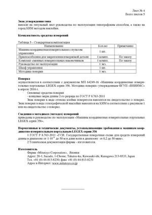 Лист № 4 Всего листов 5 Знак утверждения типа наносят на титульный лист руководства по эксплуатации типографским способом, а также на торец КИМ методом наклейки. Комплектность средства измерений Таблица 5 - Стандартная комплектация Наименование Кол-во Примечание Машина координатная измерительная с пультомуправления 1 шт. Приспособления для закрепления измеряемой детали 1 компл. По заказу Комплект сменных измерительных наконечников 1 компл. По заказу Руководство по эксплуатации 1 экз. Шкаф управления 1 шт. Методика поверки 1 экз. Поверка осуществляется в соответствии с документом МП 64249-16 «Машины координатные измери- тельные портальные LEGEX серии 356. Методика поверки» утвержденным ФГУП «ВНИИМС» в апреле 2016 г. Основные средства поверки - концевые меры длины 2-го разряда по ГОСТ Р 8.763-2011 Знак поверки в виде оттиска клейма поверителя наносится на свидетельство о поверке. Знак поверки в виде голографической наклейки наносится на КИМ в соответствии с рисунком 1 или на свидетельство о поверке. Сведения о методиках (методах) измерений приведены в руководстве по эксплуатации «Машины координатные измерительные портальные LEGEX серии 356». Нормативные и технические документы, устанавливающие требования к машинам коор- динатно-измерительным портальным LEGEX серии 356 1 ГОСТ Р 8.763-2011 «ГСИ. Государственная поверочная схема для средств измерений длины в диапазоне от 1·10-9 до 50 м и длин волн в диапазоне от 0,2 до 50 мкм». 2 Техническая документация фирмы - изготовителя. Изготовитель Фирма «Mitutoyo Corporation», Япония Адрес: 20-1, Sacado, 1-Chome, Takatsu-ku, Kawasaki-shi, Kanagawa 213-8533, Japan Тел. +81 (0) 44-813-8230; факс +81 (0) 44-813-8231 Адрес в Интернет: www.mitutoyo.co.jp