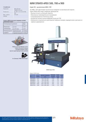 КИМ STRATO-APEX 500, 700 и 900 Спецификация Серия 355 - высокоточная КИМ с ЧПУ Разрешение 500: 0,05 мкм700/900: 0,02 мкм Эта КИМ с ЧПУ обеспечивает высокоточные измерения на максимальной скорости. Погрешность E0, MPE от: (0,7+0,25L/100) Серия STRATO-APEX имеет следующие преимущества: мкм • Высокая точность на больших скоростях Макс. скорость 519 мм/с • Максимально производительное сканирование привода • Ультрапрецизионные стеклянные шкалы • Встроенная система гашения вибраций (опция для 574) Точность КИМ указана для следующих условий • Возможность опционального дооснащения лазерным сканером, видеодатчиком и датчиком из‐ окружающей среды*: мерения шероховатости Температурный диапазон 18°C - 22°C Изменение за час 1.0 K температуры за 24 часа 2.0 K Температурный вертикальный 1.0 K/м градиент горизонтальный 1.0 K/м Наборы оснастки Mitutoyo eco-fix: - гибкая и быстрая установка - экономия времени и денег - простота адаптации для новых деталей См. брошюру "КИМ STRATO-Apex" STRATO-Apex 9106 Модели STRATO-Apex: № Модель Диапазон измерений[мм] Возможнаянагрузка[кг]Высотадетали[мм]Масса[кг] 355-522-10 574 500 x 700 x 400 180 560 1530 355-502-10 776 700 x 700 x 600 500 770 1895 355-507-10 7106 700 x 1000 x 600 800 770 2180 355-512-10 9106 900 x 1000 x 600 800 770 2410 355-517-10 9166 900 x 1600 x 600 1200 770 3085 Все продукты предназначены для продажи коммерческим клиентам. Иллюстрации продуктов приведены без каких-либо обязательств.Описания продукции, в частности технические спецификации, соответствуют действительным только при предварительном подтверждении. По571 рекомендуемым розничным ценам, пожалуйста, обратитесь к отдельному прайс-листу.