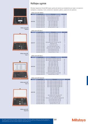 Наборы щупов Mitutoyo предлагает более 600 видов щупов для различных измерительных задач и из разного материала, например, стали, алюминия, керамики, рубина, циркония или кремния. Набор щупов M2 Addition № Содержимое Описание Длина [мм] 1x артикул K651058 5-конечный держатель щупов M2 7,5 1x артикул K651040 Стальной удлинитель M2 30 1x артикул K651039 Стальной удлинитель M2 20 4x артикул K651038 Стальной удлинитель M2 10 K651382 1x артикул K651022 Щуп сталь-рубин M2 20 1x артикул K651021 Щуп сталь-рубин M2 20 5x артикул K651019 Щуп сталь-рубин M2 20 1x артикул K651012 Щуп сталь-рубин M2 10 Набор щупов М2 2x артикул K651223 Гаечный ключ ø 1,2 мм 23 Addition Набор щупов M2 Basic 1 № Содержимое Описание Длина [мм] 1x артикул K651012 Щуп сталь-рубин M2 10 1x артикул K651014 Щуп сталь-рубин M2 10 1x артикул K651019 Щуп сталь-рубин M2 20 1x артикул K651016 Щуп сталь-рубин M2 10 1x артикул K651021 Щуп сталь-рубин M2 20 1x артикул K651022 Щуп сталь-рубин M2 20 K651377 1x артикул K6510311x артикул K651062Цилиндрический стальной щуп M2Переходник M2137 1x артикул K651054 5-конечный щуп M2 30 1x артикул K651083 Стальной дисковый щуп M2 7,5 1x артикул K651085 Дисковый щуп сталь-рубин M2 10 1x артикул K651038 Стальной удлинитель M2 10 1x артикул K651039 Стальной удлинитель M2 20 2x артикул K651223 Гаечный ключ ø 1,2 мм 23 Набор щупов M2 Basic 1 Набор щупов M2 Basic 2 № Содержимое Описание Длина [мм] 1x артикул K651235 Щуп карбид вольфрама-рубин M21x артикул K651249Щуп карбид вольфрама-рубин M21x артикул K651019Щуп сталь-рубин M21x артикул K651347Щуп карбон-рубин M21x артикул K651348Щуп карбон-рубин M2K6513541x артикул K6513491x артикул K651350Щуп карбон-рубин M2Удлинитель щупа CRP M21x артикул K651351Удлинитель щупа CRP M21x артикул K651352Удлинитель щупа CRP M21x артикул K651353Удлинитель щупа CRP M21x артикул K6510585-конечный держатель щупов M21x артикул K651223Гаечный ключ ø 1,2 мм202020505050405070907,5 Набор щупов M2 Expansion № Содержимое Описание Длина [мм] 1x артикул K651236 Щуп карбид вольфрама-рубин M2 10 Набор щупов M2 1x артикул K651248 Щуп карбид вольфрама-рубин M2 20 Basic 2 2x артикул K651257 Щуп карбид вольфрама-рубин M2 30 1x артикул K651233 Щуп карбид вольфрама-рубин M2 10 1x артикул K651276 Щуп карбид вольфрама-рубин M2 10 1x артикул K651012 Щуп сталь-рубин M2 10 1x артикул K651013 Щуп сталь-рубин M2 10 1x артикул K651014 Щуп сталь-рубин M2 10 K651378 1x артикул K651015 Щуп сталь-рубин M2 10 2x артикул K651020 Щуп сталь-рубин M2 20 1x артикул K651032 Цилиндрический щуп-рубин M2 20 1x артикул K651052 4-конечный щуп-рубин M2 10 1x артикул K651098 Наконечник щупа-карбид вольфрама M2 10 1x артикул K651083 Стальной дисковый щуп M2 7,5 1x артикул K651084 Стальной дисковый щуп M2 7,5 1x артикул K651041 Стальной удлинитель M2 40 2x артикул K651223 Гаечный ключ ø 1,2 мм 23 Набор щупов M2 Expansion Все продукты предназначены для продажи коммерческим клиентам. Иллюстрации продуктов приведены без каких-либо обязательств.Описания продукции, в частности технические спецификации, соответствуют действительным только при предварительном подтверждении. По581 рекомендуемым розничным ценам, пожалуйста, обратитесь к отдельному прайс-листу.