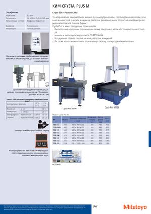 КИМ CRYSTA-PLUS M Спецификация Серия 196 - Ручные КИМ Разрешение 0,5 мкмПогрешностьE0, MPE от: (3+0,4L/100) мкмНаправляющая системаВоздушный подшипникЭто координатная измерительная машина с ручным управлением, спроектированная для обеспече‐ния очень высокой точности в широком диапазоне решаемых задач, от простых измерений разме‐ ров до комплексной оценки формы. Зажим оси Пневмозажим Crysta-Plus M имеет следующие преимущества: Микроподача Полный диапазон • Высокоточные воздушные подшипники и легкие движущиеся части обеспечивают плавность хо‐ да. • Мощное и высокопроизводительное ПО MCOSMOS. • Непрерывная плавная подача на всем диапазоне измерений. • Вы также можете использовать опциональную систему температурной компенсации. Пневматический зажим, срабатывающий по одному нажатию, с микропередачей для быстрого и легкого позиционирования Эргономичное подпружиненное кольцо для удобного управления пинолью по оси Z (только для Crysta-Plus M776 и M7106) Точность КИМ указана для следующих условий окружающей среды*: Температурный диапазон 19°C - 15°C - 21°C 30°CИзменениеза час-2.0 K Crysta-Plus M574 Crysta-Plus M7106 температуры за 24 часа - 5.0 K Температурный вертикальный 0.5 K/м 1.0 K/м Модели Crysta-Plus M: градиент горизонтальный 0.5 K/м 1.0 K/м № Модель Диапазон измерений[мм] Возможнаянагрузка[кг]Высотадетали[мм]Масса,[кг] 196-683 443 400 x 400 x 300 180 480 410 196-684D 443 400 x 400 x 300 180 480 410 Брошюра на КИМ Crysta-Plus M по запросу 196-591 544 500 x 400 x 400 180 590 512 196-592 544 500 x 400 x 400 180 590 512 196-596 574 500 x 700 x 400 180 590 646 196-597 574 500 x 700 x 400 180 590 646 196-342 776 700 x 700 x 600 500 800 1560 196-352 7106 700 x 1000 x 600 800 800 1800 Mitutoyo предлагает Вам более 600 видов щупов плюс специализированное оборудование для различных измерительных задач. MCOSMOS Все продукты предназначены для продажи коммерческим клиентам. Иллюстрации продуктов приведены без каких-либо обязательств.Описания продукции, в частности технические спецификации, соответствуют действительным только при предварительном подтверждении. По567 рекомендуемым розничным ценам, пожалуйста, обратитесь к отдельному прайс-листу.