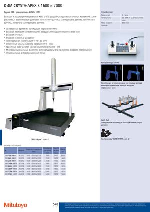 КИМ CRYSTA-APEX S 1600 и 2000 Серия 191 - стандартная КИМ с ЧПУ Спецификация Большая и высокопроизводительная КИМ с ЧПУ разработана для высокоточных измерений скани‐рованием, с возможностью установки контактного датчика, сканирующего датчика, оптическогоРазрешениеПогрешность0,1 мкмE0, MPE от: (3,3+0,45L/100)мкм датчика, лазерного сканирующего датчика. Макс. скорость 693 мм/с привода • Проверенная временем конструкция портального типа • Высокой жесткости направляющие с воздушными подшипниками на всех осях • Высокая точность • Высокие скорость и ускорение • Температурная компенсация от 16° до 24°C • Стеклянные шкалы высокого разрешения 0,1 мкм • Гранитный рабочий стол с резьбовыми отверстиями - M8 • Многофункциональный джойстик, включая два рычага и регулятор скорости перемещения • Опциональный антивибрационный стенд Контроллер-джойстик Конструкция оптимизирована при помощи метода конечных элементов и анализа методом нормальных волн Quick Rail Совершенная система для большой номенклатуры деталей CRYSTA-Apex S 163012 См. брошюру "КИМ CRYSTA-Apex S" Модели CRYSTA-Apex S: № Модель Диапазон измерений[мм] Возможнаянагрузка[кг]Высотадетали[мм]Масса,[кг] 191-286-10EU 162012 1600 x 2000 x 1200 3000 1400 9300 191-266-10EU 163012 1600 x 3000 x 1200 3500 1400 10600 191-276-10EU 164012 1600 x 4000 x 1200 4500 1400 14800 191-286H-10EU 162016 1600 x 2000 x 1600 3000 1800 9350 191-266H-10EU 163016 1600 x 3000 x 1600 3500 1800 10650 191-366H-10EU 203016 2000 x 3000 x 1600 4000 1800 14100 191-276H-10EU 164016 1600 x 4000 x 1600 4500 1800 14850 191-376H-10EU 204016 2000 x 4000 x 1600 5000 1800 19400 570 Все продукты предназначены для продажи коммерческим клиентам. Иллюстрации продуктов приведены без каких-либо обязательств.Описания продукции, в частности технические спецификации, соответствуют действительным только при предварительном подтверждении. По рекомендуемым розничным ценам, пожалуйста, обратитесь к отдельному прайс-листу. Все продукты предназначены для продажи