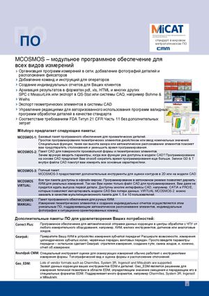 ППОО Интеллектуальные системы автоматизированногопроизводства Mitutoyoстандарт в мировомметрологическом ПО MCOSMOS – модульное программное обеспечение для всех видов измерений † Организация программ измерений в сети, добавление фотографий деталей и расположения фиксаторов † Добавление команд и инструкций для операторов † Создание индивидуальных отчетов для Ваших клиентов † Архивация результатов в форматах pdf, xls, HTML и многих других SPC с MeasurLink или экспорт в QS-Stat или системы CAQ, например Bohme & † Weihs † Экспорт геометрических элементов в системы CAD † Управление редакциями для авторизованного использования программ валидных программ обработки деталей в качестве стандарта † Соответствие требованиям FDA Титул 21 CFR Часть 11 без дополнительных затрат Mitutoyo предлагает следующие пакеты: MCOSMOS-1: Базовый пакет программного обеспечения для призматических деталей. Простое программирование геометрических элементов джойстиком или ввод номинальных значений. Специальные функции, такие как высота зазора или автоматическое распознавание элементов поможет вам предотвратить столкновения и уменьшить время программирования. MCOSMOS-2: Пакет CAD для поверхности произвольной формы и геометрических элементов. Зачем вручную вводить параметры, когда все функции уже доступны в модели CAD? Программирование на основе CAD предлагает Вам способ сократить время программирования еще больше. Записи GD & T внутри файла CAD помогут вам измерить все основные характеристики. MCOSMOS-3: Полный пакет. MCOSMOS-3 предоставляет дополнительные инструменты для оценки контуров в 2D или на модели CAD MCOSMOSVIRTUAL:Все три пакета доступны в офлайн-версии. Программирование в автономном режиме позволяет держатьКИМ для реальных измерений. Так как Вам нужен только файл CAD для программирования, Вам даже непридется ждать выпуска первой детали. Доступны многие интерфейсы CAD, например, CATIA и PRO/E, которые позволяют импортировать модели CAD без потери данных. VIRTUAL MCOSMOS-2 можно заказать в качестве мультилицензионного пакета для 1, 5 и 10 пользователей. MCOSMOS Пакет программного обеспечения для ручных КИМ. MANUAL: Измерение геометрических элементов и создание индивидуальных отчетов осуществляется этим уникальным ПО, поддерживающим автоматическое распознавание элементов, индивидуальные фотографии и ситуационно-ориентированных команд. Дополнительные пакеты ПО для удовлетворения Ваших потребностей: Correct Plus: Программное обеспечение для автоматической отправки данных коррекции в центры обработки с ЧПУ от любого измерительного оборудования, например, КИМ, мелких инструментов, датчиков или аналоговые зондов. Gearpak: Превратите Вашу КИМ в устройство измерения зубчатой передачи! Расширьте возможности, измерения цилиндрических зубчатых колес, червячных передач, винтовых передач. Просто введите параметры передачи – остальное сделает Gearpak: стратегия измерения, создание пути, смена зондов, и, конечно, отчет об измерении. Roundpak CMM: Специальный инструмент оценки для сканирующих измерений обычно работает с инструментами измерения формы. Топографический вид и оценка формы и расположение отклонений. Geo_EDM: Lots of vendor formats such as Charmilles, System 3R, Ingersoll and Mitsubishi are supported. Захват данных коррекции ваших инструментов EDM и деталей. Geo_EDM является решением для измерения типичной геометрии в области EDM, определяющим значение смещения и передающим