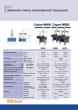 z Height Широкий спектр качественной продукции. Серия M400 Серия M500 y x Depth Width M443 M544 M574 Диапазон измерения Ось X 400 мм 500 мм 500 мм Ось Y 400 мм 400 мм 700 мм Ось Z 300 мм 400 мм 400 мм Заготовка Макс. высота 510 мм Макс. масса 180 кг Натяжение заготовки Кол-во отв. М8 13 9 13 Отклонение ТР20 ISO 10360-2 MPEE = (3.0+0.4 L /100) мкм MPEE = (3.5+0.4 L /100) мкм измерения длины ТР8 (20°С±1°С) MPEE = (4.0+0.4 L /100) мкм MPEE = (4.5+0.4 L /100) мкм Контактное отклонение TP20/TP8 ISO 10360-2 MPEP = 4мкм / 5мкм MPEP = 4мкм\ / 5 мкм Допустимая темп. окружения* 15-30°С 19-21°С Перепад температуры макс. 2,0 K/ч, 5,0 K/24ч макс. 2,0 K/ч, 5,0 K/24ч вертик. и горизонт. макс. 1,0 K/м макс. 1,0 K/м Система измерения длины Разрешение 0,5 мкм 0,5 мкм Направляющие Возд. подшипники на всех осях Возд. подшипники на всех осях Фиксация осей Быстрая фиксация всех осей, Быстрая фиксация всех осей, пневматическая пневматическая Измерительный стол Материал Гранит Гранит Размеры 624 х 805 мм 638 х 860 мм 638 х 8116060 мм Подача воздуха Потребление/ ок. 12,5 л/мин ок. 12,5 л/мин при 0,4 МПа давление воздуха при 0,35 МПа Расход 25 л/мин при 0,5-0,9 МПа 25 л/мин при 0,5 -0,9 МПа Размеры Ширина 981 мм 1082 мм Глубина 1047 мм 1078 мм 1458 мм Высота 1967 мм 2285 мм опорным столом 410 кг 495 кг 615 кг Precision figures are based on a TP20/TP8 measuring head with ø 3 x 10 mm probe ø 4 x 10 mm / ø 4 x 20 mm; * when optional thermal error compensation is used