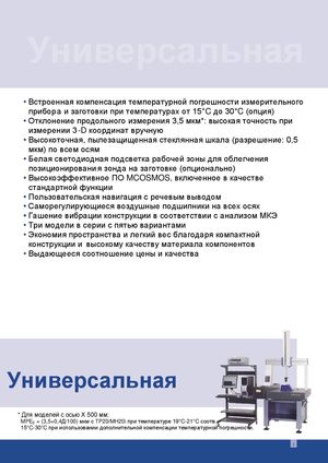 Универсальная • Встроенная компенсация температурной погрешности измерительного прибора и заготовки при температурах от 15°C до 30°C (опция) • Отклонение продольного измерения 3,5 мкм*: высокая точность при измерении 3 -D координат вручную • Высокоточная, пылезащищенная стеклянная шкала (разрешение: 0,5 мкм) по всем осям • Белая светодиодная подсветка рабочей зоны для облегчения позиционировани я зонда на заготовке (опционально) • Высокоэффективное ПО MCOSMOS, включенное в качестве стандартной функции • Пользовательская навигация с речевым выводом • Саморегулирующиеся воздушные подшипники на всех осях • Гашение вибрации конструкции в соответствии с анализом МКЭ • Три модели в серии с пятью вариантами • Экономия пространства и легкий вес благодаря компактной конструкции и высокому качеству материала компонентов • Выдающееся соотношение цены и качества Универсальная * Для моделей с осью Х 500 мм: MPEE = (3,5+0,4Д/100) мкм с TP20/MH20i при температуре 19°C-21°C соотв. 15°C-30°C при использовании дополнительной компенсации температурной погрешности. 7