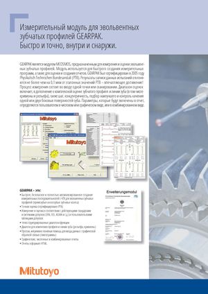Измерительный модуль для эвольвентных зубчатых профилей GEARPAK. Быстро и точно, внутри и снаружи. GEARPAK является модулем MCOSMOS, предназначенным для измерения и оценки эвольвент- ных зубчатых профилей. Модуль используется для быстрого создания измерительных программ, а также для оценки и создания отчетов. GEARPAK был сертифицирован в 2005 году Physikalisch Technischen Bundesanstalt (PTB). Результаты записи данных испытаний отклоня- ются не более чем на 0,1 мкм от эталонных значений PTB – впечатляющее достижение! Процесс измерения состоит во вводе одной точки или сканировании. Диапазон оценок включает, в дополнение к комплексной оценке зубчатого профиля и линии зуба (в том числе кривизны и рельефа), также шаг, концентричность, подбор наилучшего и контроль качения одной или двух боковых поверхностей зуба. Параметры, которые будут включены в отчет, определяются пользователем в числовом или графическом виде, или в комбинированном виде. GEARPAK – это: • Быстрое, безопасное и полностью автоматизированное создание измерительных последовательностей с ЧПУ для эвольвентных зубчатых профилей (прямозубые и косозубые зубчатые колеса) • Точная оценка (сертифицировано PTB) • Измерение и оценка в соответствии с действующими стандартами и системами допусков (DIN, ISO, AGMA и т.д.) и пользовательскими таблицами допусков • Четко структурированные диалоги и функции • Диалоги для изменения профиля и линии зуба (рельефа, кривизны) • Простая, интуитивно понятная помощь для ввода данных с графической обратной связью (пиктограммы) • Графические, численные и комбинированные отчеты • Отчеты в формате HTML
