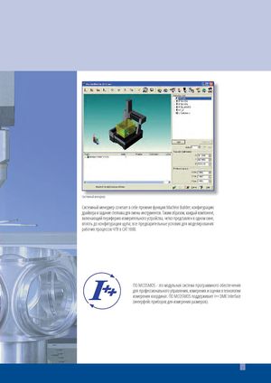 Системный менеджер Системный менеджер сочетает в себе прежние функции Machine Builder, конфигурацию драйвера и задание стеллажа для смены инструментов. Таким образом, каждый компонент, включающий периферию измерительного устройства, четко представлен в одном окне, вплоть до конфигурации щупа; все предварительные условия для моделирования рабочих процессов ЧПУ в CAT 1000. ПО MCOSMOS - это модульная система программного обеспечения для профессионального управления, измерения и оценки в технологии измерения координат. ПО MCOSMOS поддерживает I++ DME Interface (интерфейс приборов для измерения размеров). 7