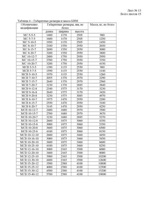 Лист № 13 Всего листов 15 Таблица 4 – Габаритные размеры и масса КИМ Обозначение Габаритные размеры, мм, не Масса, кг, не более модификации более длина ширина высота МС 5-5-5 1400 1170 2505 980 МС 5-7-5 1600 1170 2505 1250 МС 5-10-5 1950 1170 2505 1450 МС 8-10-7 2180 1550 2950 2650 МС 8-15-7 2690 1550 2950 3000 МС 8-20-7 3200 1550 2950 3800 МС 10-12-7 2400 1750 2950 2950 МС 10-15-7 2700 1750 2950 3350 МС 10-20-7 3200 1750 2950 4150 МСВ 5-5-5 1390 1135 2550 980 МСВ 5-7-5 1590 1135 2550 1140 МСВ 5-10-5 1970 1135 2550 1260 МСВ 7-10-7 2055 1370 2970 2290 МСВ 7-15-7 2640 1370 2970 2560 МСВ 7-20-7 3230 1370 2885 3840 МСВ 9-12-8 2340 1575 3170 3230 МСВ 9-16-8 2640 1575 3170 3420 МСВ 9-20-8 3230 1575 3085 4970 МСВ 8-10-7 1975 1470 2950 2200 МСВ 8-15-7 2550 1470 2950 3100 МСВ 8-20-7 3145 1470 2950 4250 МСВ 10-12-7 2400 1680 2970 3500 МСВ 10-15-7 2700 1680 2970 3670 МСВ 10-20-7 3230 1680 2885 5270 МСВ 10-12-8 2600 1875 3060 4350 МСВ 10-15-8 3000 1875 3060 5350 МСВ 10-20-8 3600 1875 3060 6500 МСВ 10-25-8 4100 1875 3060 8150 МСВ 10-12-10 2600 1875 3460 4450 МСВ 10-16-10 3000 1875 3460 5450 МСВ 10-20-10 3600 1875 3460 6600 МСВ 10-25-10 4100 1875 3460 8250 МСВ 12-16-10 3000 2165 3500 6000 МСВ 12-20-10 3400 2165 3500 8000 МСВ 12-25-10 3900 2165 3500 10200 МСВ 12-30-10 4400 2165 3500 12600 МСВ 15-20-12 3500 2580 4100 10800 МСВ 15-25-12 4000 2580 4100 12500 МСВ 15-30-12 4500 2580 4100 15200 МСВ 15-40-12 5700 2580 4100 19000