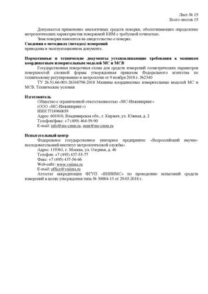 Лист № 15 Всего листов 15 Допускается применение аналогичных средств поверки, обеспечивающих определение метрологических характеристик поверяемой КИМ с требуемой точностью. Знак поверки наносится на свидетельство о поверке. Сведения о методиках (методах) измерений приведены в эксплуатационном документе. Нормативные и технические документы устанавливающие требования к машинам координатным измерительным моделей МС и МСВ Государственная поверочная схема для средств измерений геометрических параметров поверхностей сложной формы утвержденная приказом Федерального агентства по техническому регулированию и метрологии от 9 ноября 2018 г. №2340 ТУ 26.51.66-001-26348798-2018 Машины координатные измерительные моделей МС и МСВ. Технические условия Изготовитель Общество с ограниченной ответственностью «МС-Инжиниринг» (ООО «МС-Инжиниринг») ИНН 7718960659 Адрес: 601010, Владимирская обл., г. Киржач, ул. Южная, д. 2 Телефон/факс: +7 (499) 464-59-90 E-mail: info@ms-cmm.ru, mnn@ms-cmm.ru Испытательный центр Федеральное государственное унитарное предприятие «Всероссийский научно- исследовательский институт метрологической службы» Адрес: 119361, г. Москва, ул. Озерная, д. 46 Телефон: +7 (495) 437-55-77 Факс: +7 (495) 437-56-66 Web-сайт: www.vniims.ru E-mail: office@vniims.ru Аттестат аккредитации ФГУП «ВНИИМС» по проведению испытаний средств измерений в целях утверждения типа № 30004-13 от 29.03.2018 г.