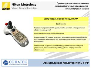Nikon Metrology Производитель высокоточных исверхвысокоточных координатно- Vision Beyond Precision измерительных машин Беспроводный джойстик для КИМ Особенности Позволяет управлять КИМ одной рукой и работать с программным обеспечением другой Функция автоматического выключения Клавиатура из 18 клавиш позволяет использовать ряд функций КИМ и программного обеспечения без использования мыши и клавиатуры компьютера Совокупность 15 разных светодиодов, расположенных на пульте управления, показывает статус КИМ, датчика и программного обеспечения. Официальный представитель в РФ
