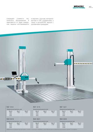 20|21 сокращают стоимость тех- в версиях с ручным, моторизо- нического обслуживания. В ванным и CNC управлением, а зависимости от задач измере- также в ручной/CNC версии с ния, машины изготавливаются разъёмными приводами. RAF 1012 RAF 1215 RAF 1621 Измерительный диапазон (мм) Измерительный диапазон (мм) Измерительный диапазон (мм) Ось X Ось Y Ось Z Ось X Ось Y Ось Z Ось X Ось Y Ось Z 4000 1000 1200 4000 1200 1500 4000 1600 2100 5000 5000 5000 6000 6000 6000 RAD 3018 RAD 3021 RAD 3025 Измерительный диапазон (мм) Измерительный диапазон (мм) Измерительный диапазон (мм) Ось X Ось Y Ось Z Ось X Ось Y Ось Z Ось X Ось Y Ось Z 5500 3000 1800 5500 3000 2100 8000 3000 2500 6000 6000 10000 6500 6500 12000 Измерительный диапазон для всех машин с плитой из чугуна до X= 40.000 мм, с шагом 500 мм, другие измерительные диапазоны поосям Y-Z по запросу.