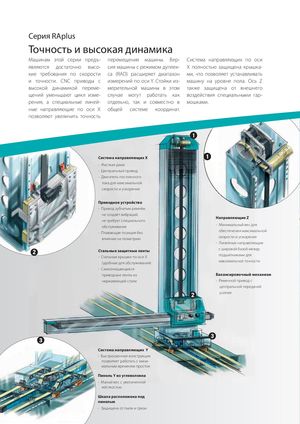 Серия RAplus Точность и высокая динамика Машинам этой серии предъ- перемещения машины. Вер- Система направляющих по оси являются достаточно высо- сия машины с режимом дуплек- X полностью защищена крышка- кие требования по скорости са (RAD) расширяет диапазон ми, что позволяет устанавливать и точности. CNC приводы с измерений по оси Y. Стойки из- машину на уровне пола. Ось Z высокой динамикой переме- мерительной машины в этом также защищена от внешнего щений уменьшают цикл изме- случае могут работать как воздействия специальными гар- рения, а специальные линей- отдельно, так и совместно в мошками. ные направляющие по оси Х общей системе координат. позволяют увеличить точность Система направляющих Х - Жесткая рама - Центральный привод - Двигатель постоянного тока для максимальной скорости и ускорения Приводное устройство - Привод зубчатым ремнём не создаёт вибраций, Направляющие Z не требует специального обслуживания - Минимальный вес для - Плавающая позиция без обеспечения максимальной влияния на геометрию скорости и ускорения - Линейные направляющие Стальные защитные ленты с широкой базой между - Стальные крышки по оси X подшипниками для (удобные для обслуживания) максимальной точности - Самоочищающиеся приводные ленты из Балансировочный механизм нержавеющей стали - Ременной привод с центральной передачей усилия Система направляющих Y - Быстросменная конструкция позволяет работать с мини- мальным временем простоя Пиноль Y из углеволокна - Малый вес с увеличенной жёсткостью Шкала расположена под пинолью - Защищена от пыли и грязи