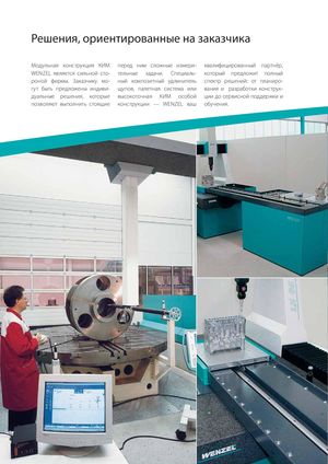 Решения, ориентированные на заказчика Модульная конструкция КИМ перед ним сложные измери- квалифицированный партнёр, WENZEL является сильной сто- тельные задачи. Специаль- который предложит полный роной фирмы. Заказчику мо- ный композитный удлинитель спектр решений: от планиро- гут быть предложены индиви- щупов, палетная система или вания и разработки конструк- дуальные решения, которые высокоточная КИМ особой ции до сервисной поддержки и позволяют выполнить стоящие конструкции — WЕNZEL ваш обучения.