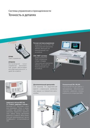 Системы управления и принадлежности Точность в деталях Ручная система управления: · Цифровой счётчик WPZ 100 · Персональный компьютер · WENZEL Metrosoft CM · Компьютерный стол на колёсах HT400 CNC/ MOT система: Пульт управления · Шкаф управления · Пульт управления HT400 RC HT400 / HT400RC Беспроводной пульт · Персональный компьютер управления. Эргономич- · WENZEL Metrosoft CM ный дизайн обеспечивает · Компьютерный стол многофункциональность и на колёсах удобство в работе. Дополнительный кронштейн Планшетный ПК с WLAN LCD монитор 15’’, закреплённый Портативный ПК для работы с вместе с клавиатурой, трекболом программным обеспечением или мышью на поворотном крон- позволяет увеличить степень штейне. мобильности оператора КИМ. Цифровой счётчик WPZ100 3-х осевой цифровой счётчик с большим LCD - дисплеем с восе- мью разрядами. Сброс и преду- становка для каждой оси. Под- ключение педального выключа- теля, выбор между функциями диаметра и радиуса. Ввод диаме- тров для фиксированных щупов. Коэффициент интерполяции до 200.