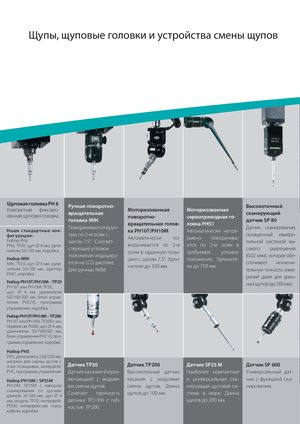 Щупы, щуповые головки и устройства смены щупов Щуповая головка PH 6Компактнаяфиксиро-ванная щуповая головкаРучная поворотно-вращательнаяголовка MIHПоворачивается вруч-МоторизованнаяМоторизованнаяповоротно-сервоприводная го-вращательная голов-ловка PHS1Высокоточныйсканирующийдатчик SP 80Датчиксканирования, Наши стандартные кон-фигурации:ную по 2-м осям сНабор PH6шагом 7.5°. Соответ-PH6, TP20, щуп Ø 4 мм, удли-нители 50/100 мм, коробкаствующее угловоека PH10T/PH10MАвтоматическинепре-оснащенныйизмери-Автоматическипо-рывноповорачива-ворачиваетсяпо2-метсяпо2-мосямвтельнойсистемойвы-сокогоразрешенияосям в заданную пози-требуемоеугловое Набор MIH положение индициру- (0.02 мкм), которая обе-цию с шагом 7.5°. Удли-положение.Удлините- MIH, TP20, щуп Ø 4 мм, удли- ется на LCD дисплее.нители50/100мм,адаптерДля ручных КИМ.нители до 300 мм.ли до 750 мм.спечиваетисключи-тельную точность изме- PAA1, коробка рений даже для длин- Набор PH10T/PH10M – TP20 ных щупов (до 500 мм). PH10T или PH10M, TP20, щуп Ø 4 мм, удлинители 50/100/200 мм, блок управ- ления PHC10, программа управления, коробка Набор PH10T/PH10M – TP200 PH10T или PH10M, TP200 с ин- терфейсом PI200, щуп Ø 4 мм, удлинители 50/100/200 мм, блок управления PHC10, про- грамма управления, коробка Набор PHS PHS, удлинители 330/500 мм, магазин для смены щупов с4-мя позициями, интерфейсДатчик TP20Датчик TP200 Датчик SP25 M Датчик SP 600 PHS, программа управления Датчик касания (перек- Высокоточный датчик Наиболее компактная Универсальный дат- Набор PH10M / SP25M лючающий) с модуля- касания с модулями и универсальная ска- чик с функцией ска- PH10M, SP25M с набором ми смены щупов. смены щупов. Длина нирующая щуповая си- нирования. сканирования со щупамидлиной 20-200 мм, щуп Ø 4Сочетаетпрочностьщупов до 100 мм .стемавмире. Длина мм, модуль TP20, интерфейс датчика TP2-5W с гиб- щупов до 200 мм. PI200, интерфейсная плата, костью TP200. кабели, коробка