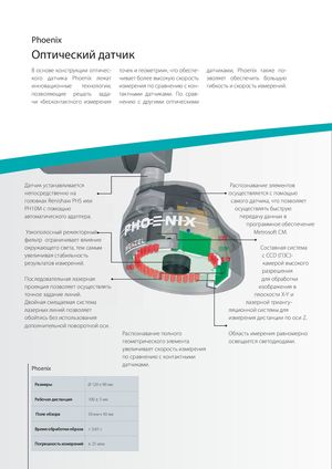Phoenix Оптический датчик В основе конструкции оптичес- точек и геометрии», что обеспе- датчиками, Phoenix также по- кого датчика Phoenix лежат чивает более высокую скорость зволяет обеспечить большую инновационные технологии, измерения по сравнению с кон- гибкость и скорость измерений. позволяющие решать зада- тактными датчиками. По срав- чи «бесконтактного измерения нению с другими оптическими Датчик устанавливается Распознавание элементов непосредственно на осуществляется с помощью головках Renishaw PHS или самого датчика, что позволяет PH10M c помощью осуществлять быструю автоматического адаптера. передачу данных в программное обеспечение Узкополосный режекторный Metrosoft CM. фильтр ограничивает влияние окружающего света, тем самым Составная система увеличивая стабильность с CCD (ПЗС)- результатов измерений. камерой высокого разрешения Последовательная лазерная для обработки проекция позволяет осуществлять изображения в точное задание линий. плоскости X-Y и Двойная смещаемая система лазерной триангу- лазерных линий позволяет ляционной системы для обойтись без использования измерения дистанции по оси Z. дополнительной поворотной оси. Распознавание полного Область имерения равномерно геометрического элемента освещается светодиодами. увеличивает скорость измерения по сравнению с контактными Phoenix датчиками. Размеры Ø 120 x 90 мм Рабочая дистанция 100 ± 5 мм Поле обзора 30 мм x 40 мм Время обработки образа < 0,65 c Погрешность измерений ± 25 мкм