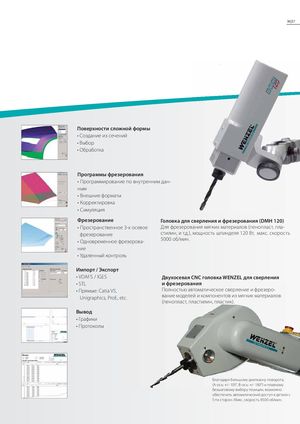 36|37 Поверхности сложной формы • Создание из сечений • Выбор • Обработка Программы фрезерования • Программирование по внутренним дан- ным • Внешние форматы • Корректировка • Симуляция Фрезерование Головка для сверления и фрезерования (DMH 120) • Пространственное 3-х осевое Для фрезерования мягких материалов (пенопласт, пла- фрезерование стилин, и т.д.), мощность шпинделя 120 Вт, макс. скорость • Одновременное фрезерова- 5000 об/мин. ние • Удаленный контроль Импорт / Экспорт • VDAFS / IGES Двухосевая CNC головка WENZEL для сверления • STL и фрезерования • Прямые: Catia V5, Полностью автоматическое сверление и фрезеро- Unigraphics, ProE, etc. вание моделей и компонентов из мягких материалов (пенопласт, пластилин, пластик). Вывод • Графики • Протоколы Благодаря большому диапазону поворота, (A-ось: +/- 105°, B-ось: +/- 180°) и плавному безшаговому выбору позиции, возможно обеспечить автоматический доступ к детали с 5-ти сторон. Макс. скорость 8500 об/мин.