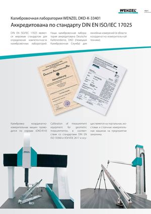40|41 Калибровочная лаборатория WENZEL DKD-K-33401 Аккредитована по стандарту DIN EN ISO/IEC 17025 DIN EN ISO/IEС 17025 являет- Наша калибровочная лабора- линейных измерений (в области ся мировым стандартом для тория аккредитована Deutsche координатно-измерительной определения компетентности Kalibrierdienst, DKD (Немецкая техники). калибровочных лабораторий. Калибровочная Служба) для Калибровка координатно- Calibration of measurement ществляется на портальных, мо- измерительных машин прово- equipment for geometric стовых и стоечных измеритель- дится по нормам «DKD-R-43 measurements», в соответ- ных машинах на предприятии ствии со стандартами DIN EN заказчика. ISO 10360 и VDI/VDE 2617 и осу-