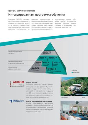 Центры обучения WENZEL Интегрированная программа обучения Компания WENZEL произво- освоение теоретических и теоретические модули обу- дит подготовку специалистов в практических знаний в области чения AUKOM дополняются области координатной метро- координатных измерений. Про- модулями обучения универ- логии. Наша программа обуче- грамма обучения представляет сальному программному обе- ния сочетает в себе уникальные собой разветвлённую структу- спечению (Metrosoft CM). методики, направленные на ру подготовки специалистов, — Обучение на уровне эксперта Обучение на уровне опытного пользователя Обучение на уровне оператора AUKOM METROSOFT Модули AUKOM: Программа обучения AUKOM является промышленным стандартом обучения в области координатной метрологии, не зависящей от конкретного оборудова- ния. Обучение является профессиональ- ной базой для подготовки специалистов в области координатных измерений. Villa Marburg - Wenzel . Модули программного обеспечения: Модули программного обеспечения базируются на программе Metrosoft CM и обеспечивают специалистов практиче- скими знаниями для решения требуемых метрологических задач.