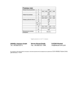 Размеры [мм] Измерительный диапазон X 1200 Y* 1600 2000 2500 3000 Z 1000 Габаритные размеры W 2190 L 3077 3477 3977 4487 H 3590 3590** 3550 3600 Размеры рабочей области H1 1258 H2 1188 H3 (PH10M) 90 H3 (SP80) 145 H4 700 700** 660 710 L1 2715 3115 3615 4115 W1 1440 Минимальные размерыпомещения H5 100 (min.) *Другие диапазоны по оси Y по запросу WENZEL Präzision GmbH Werner-Wenzel-Straße D-97859 Wiesthal Tel: +49 6020 201-0 Fax: +49 6020 201-1999 info@wenzel-cmm.com Мы оставляем за собой право изменять конструкцию и технические характеристики без предварительного уведомления. © 2014 WENZEL Präzision GmbH, действительно с 11/2014