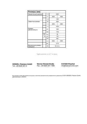 Размеры [мм] Измерительный диапазон X 2000 Y* 3000 4000 Z 1500 Габаритные размеры W 3320 L 4850 5850 H 4700 Размерырабочей области H1 1825 H2 1700 H3 (PH10M) 90 H3 (SP80) 145 H4 660 L1 4000 5000 W1 2170 Минимальные размерыпомещения H5 50 (min.) *Другие диапазоны по оси Y по запросу WENZEL Präzision GmbH Werner-Wenzel-Straße D-97859 Wiesthal Tel: +49 6020 201-0 Fax: +49 6020 201-1999 info@wenzel-cmm.com Мы оставляем за собой право изменять конструкцию и технические характеристики без предварительного уведомления. © 2014 WENZEL Präzision GmbH, действительно с 05/2012