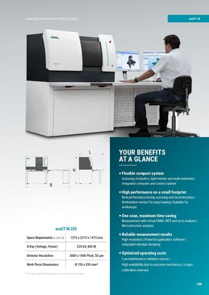 PCROOMDPUUKTTESDEGTMOEMNOTGCROAMPPHUYTPERTOODMUOCGTRRAAPNHGIEE exaCT® M L YOUR BENEFITS AT A GLANCE H P Flexible compact system Scanning of plastics, light metals and multi-materials | B Integrated computer and control cabinet P High performance on a small footprint Best performance during scanning and reconstruction | Workstation version for easy loading | Suitable for workshops P One scan, maximum time saving Measurement with virtual CMM | NDT and error analysis | Microstructure analysis exaCT M 225 P Reliable measurement results Space Requirements (L x B x H) 1275 x 2315 x 1415 mm High resolution | Powerful application software | X-Ray (Voltage, Power) 225 kV, 800 W Integrated vibration damping Detector Resolution 3600 x 1000 Pixel, 50 µm P Optimized operating costs Low-maintenance radiation source | Work Piece Dimensions Ø 150 x 250 mm* High availability due to precision mechanics | Longer calibration intervals * The measurable height depends on the component diameter. 109